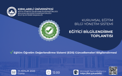 | EĞİTİM ÖĞRETİM DEĞERLENDİRME SİSTEMİ (EDS) GÜNCELLEMELERİ BİLGİLENDİRME TOPLANTISI DUYURUSU 75 Okunma Üniversitemiz Kurumsal Eğitim Bilgi Yönetimi Sistemleri kapsamında yer alan Eğitim Öğretim... | ||